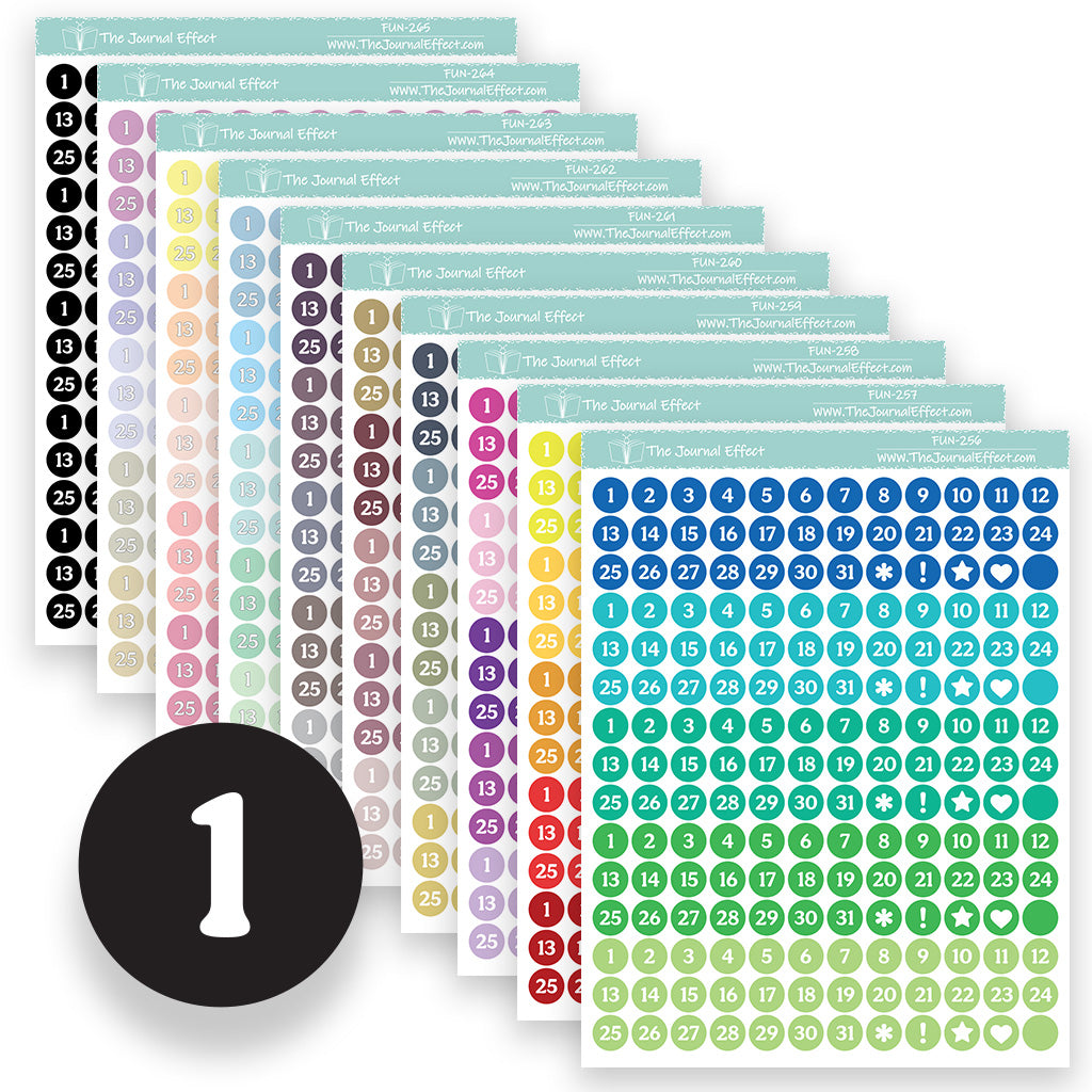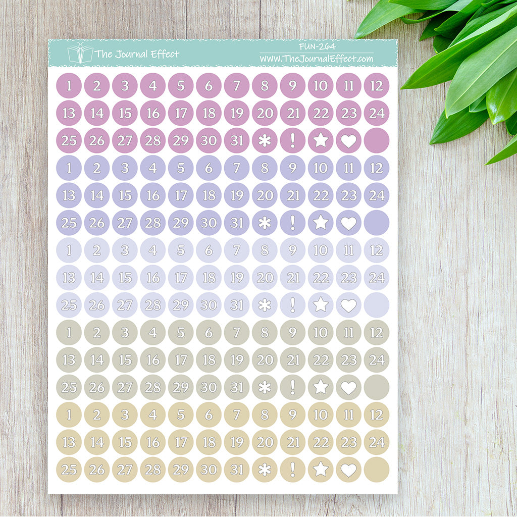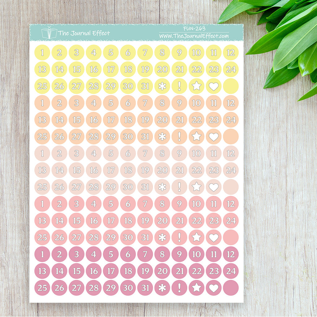 Each sheet contains 5 sets of date dot stickers in a range of colors. These date dots are small enough to fit in your calendar or as weekday headers, but large enough to cover most dates in your dated planner.