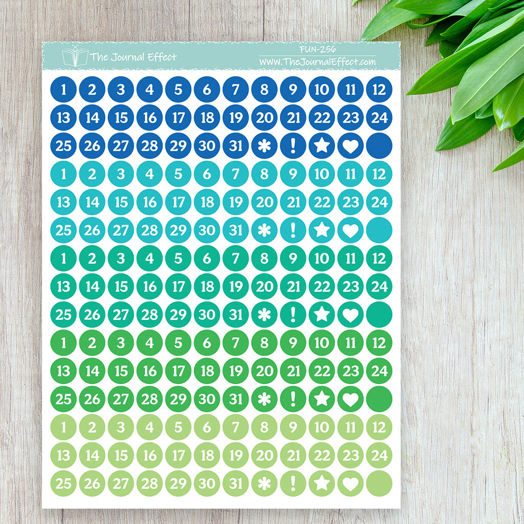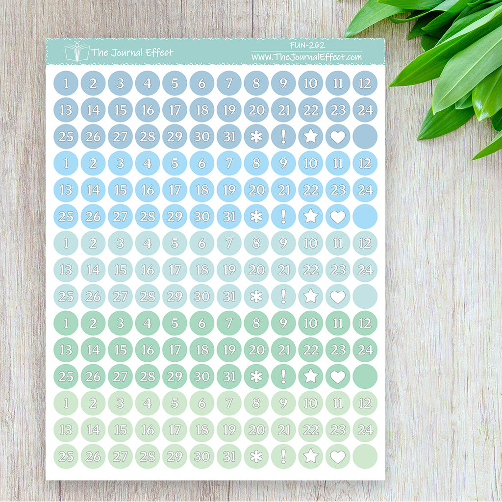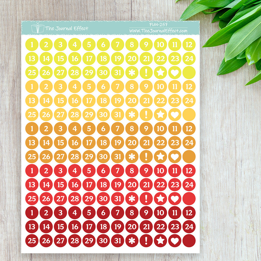 Each sheet contains 5 sets of date dot stickers in a range of colors. These date dots are small enough to fit in your calendar or as weekday headers, but large enough to cover most dates in your dated planner.
