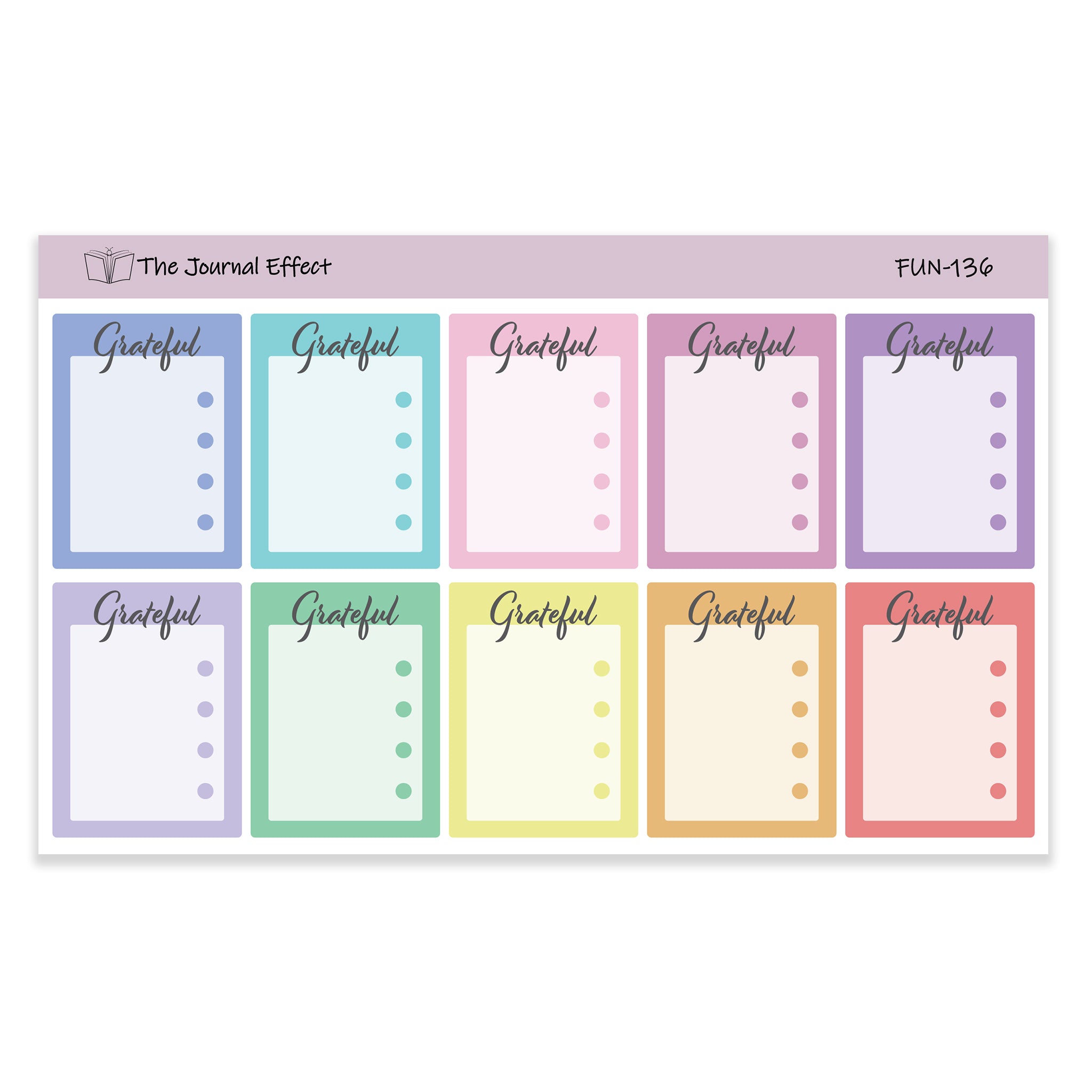 Keep a positive mindset by reminding yourself what you are grateful for. Use these stickers in your planner or journal to remember to appreciate the little things in life.