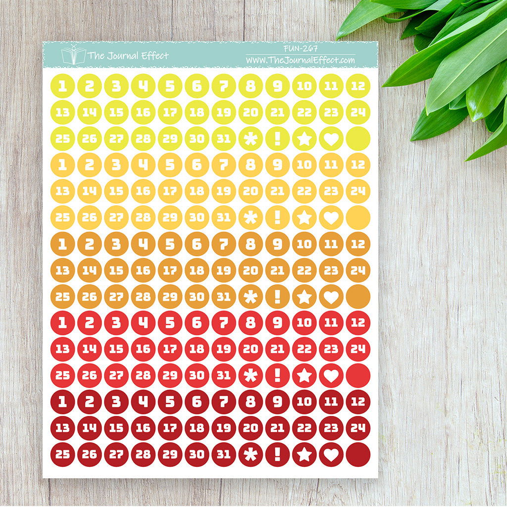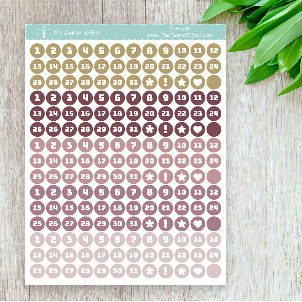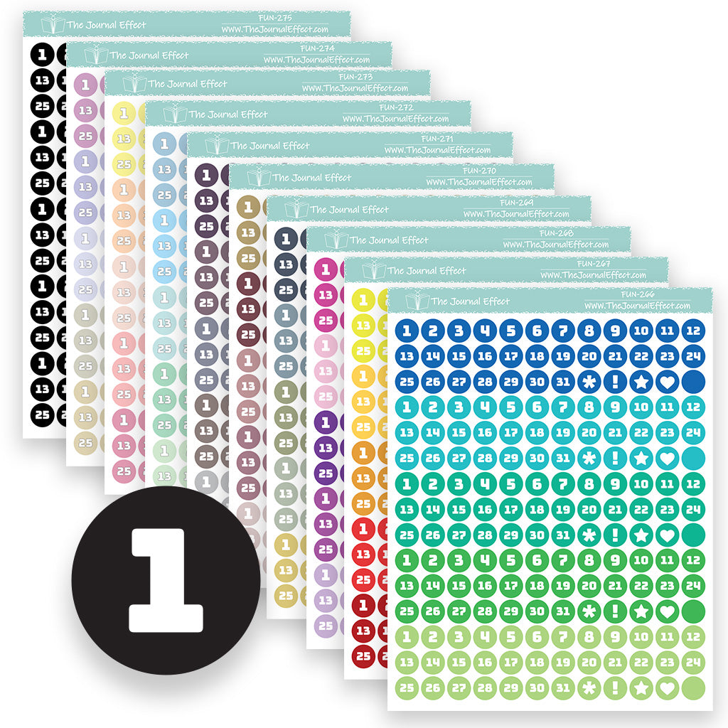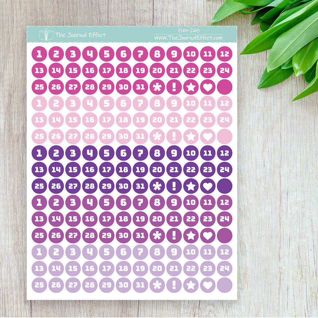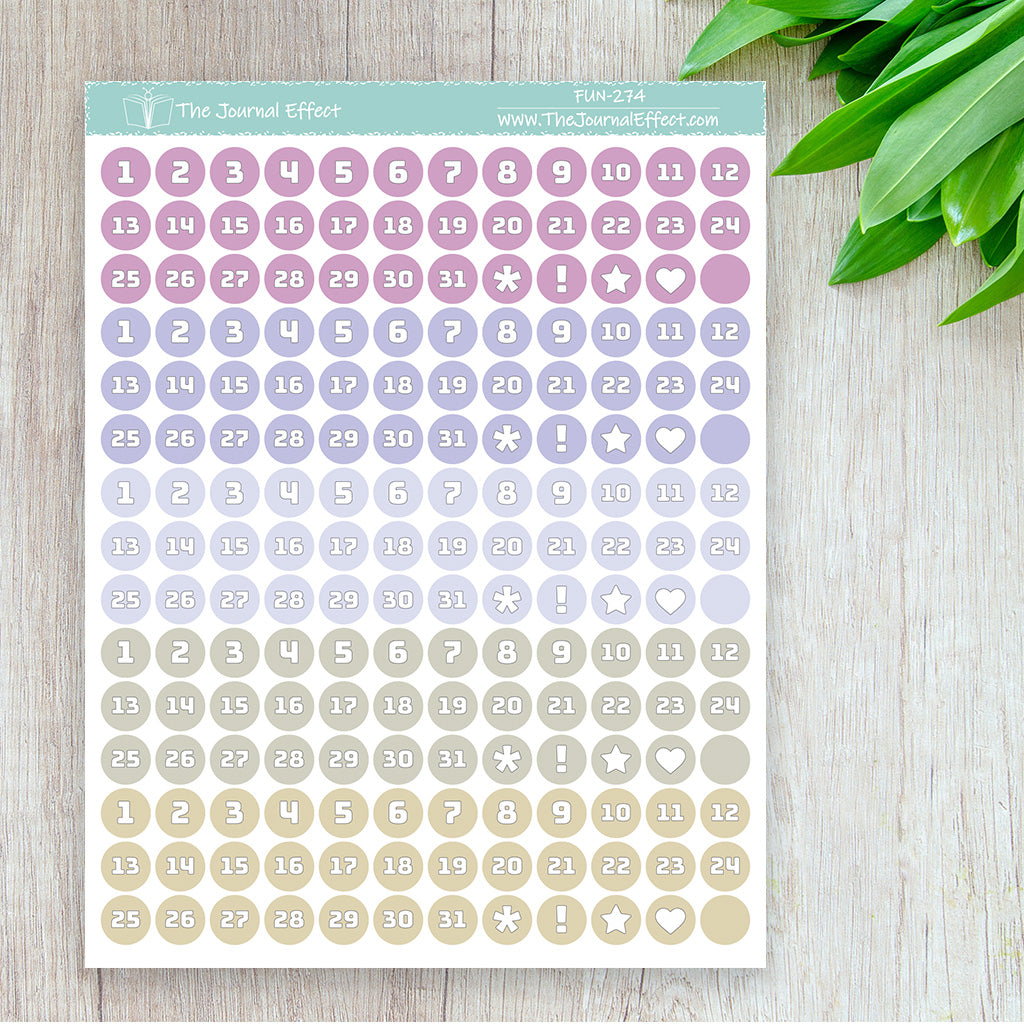Each sheet contains 5 sets of date dot stickers in a range of colors. These date dots are small enough to fit in your calendar or as weekday headers, but large enough to cover most dates in your dated planner.