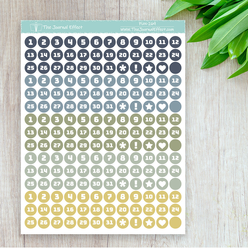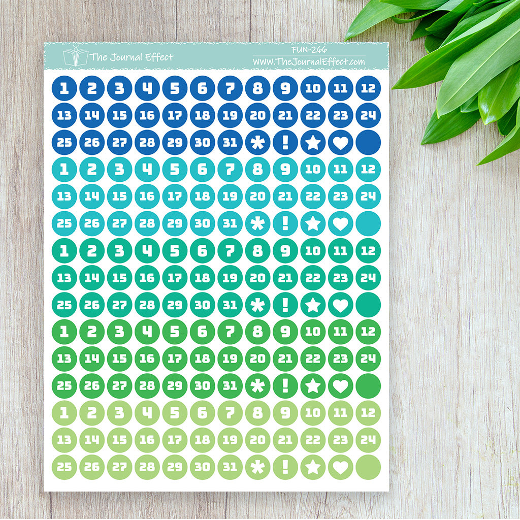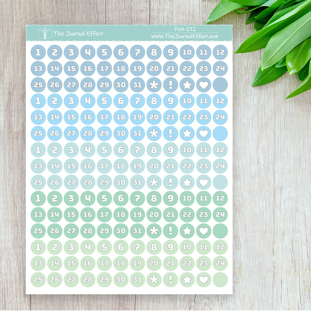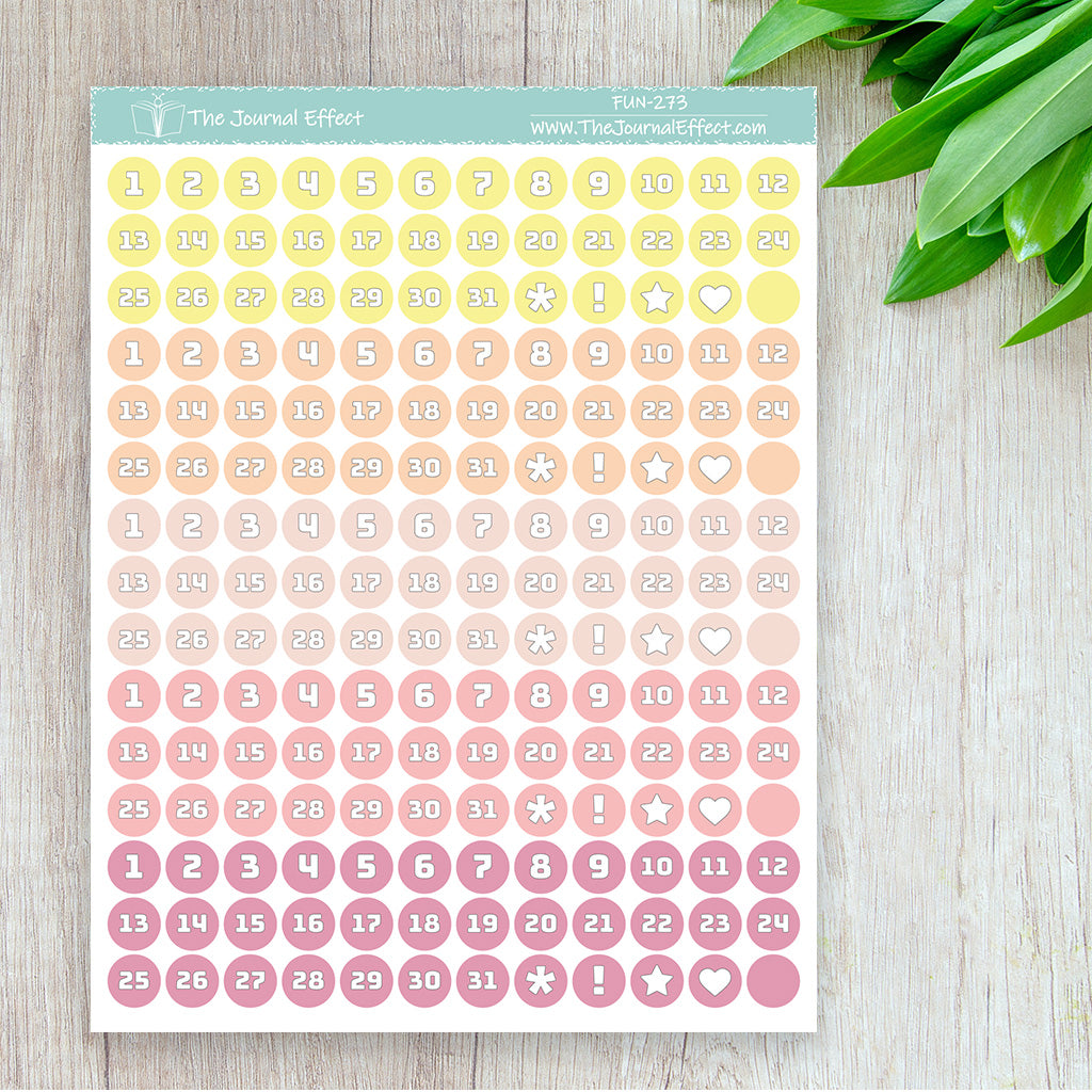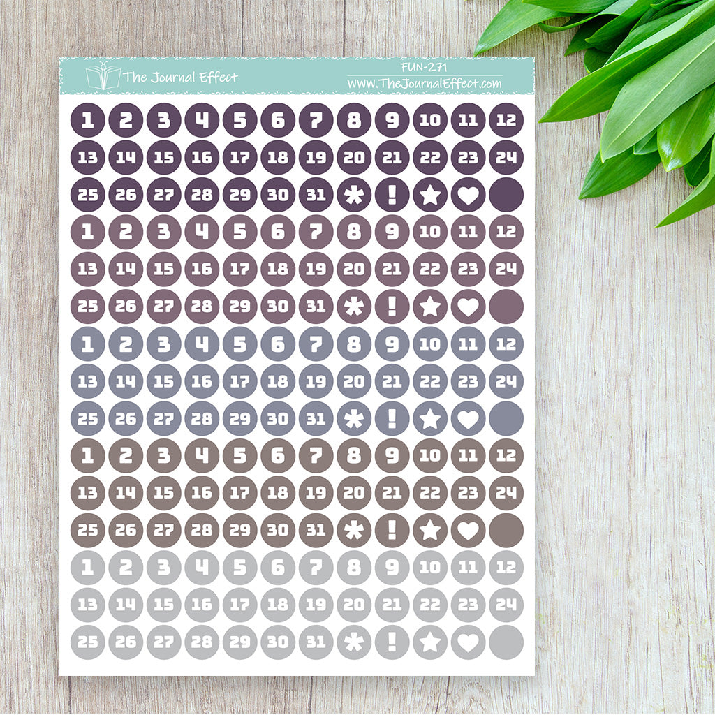 Each sheet contains 5 sets of date dot stickers in a range of colors. These date dots are small enough to fit in your calendar or as weekday headers, but large enough to cover most dates in your dated planner.